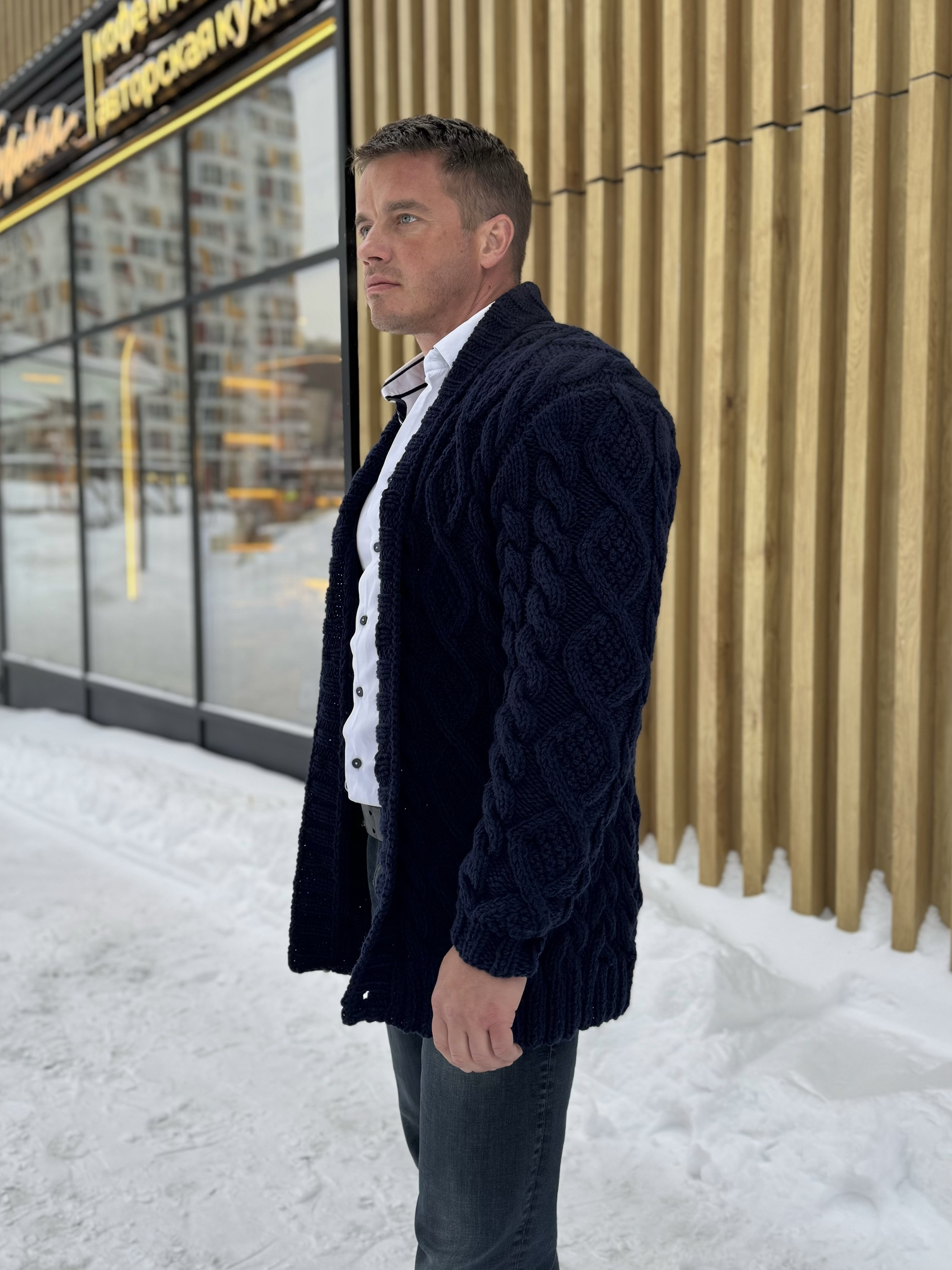 - Мужская коллекция: стильные кардиганы, шерстяные свитера и водолазки, шарфы с чисто мужской харизмой. Широкий выбор фасонов и вязаных узоров, от лаконичных до затейливых и объемных.