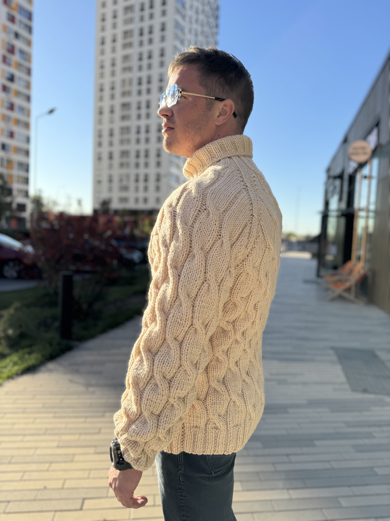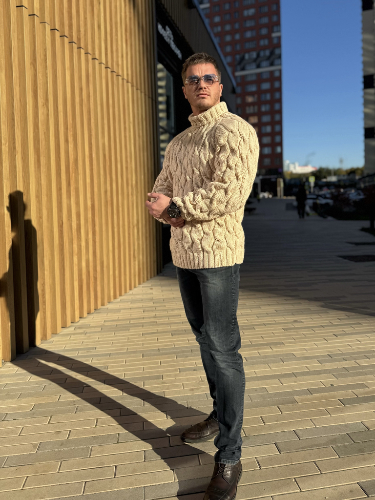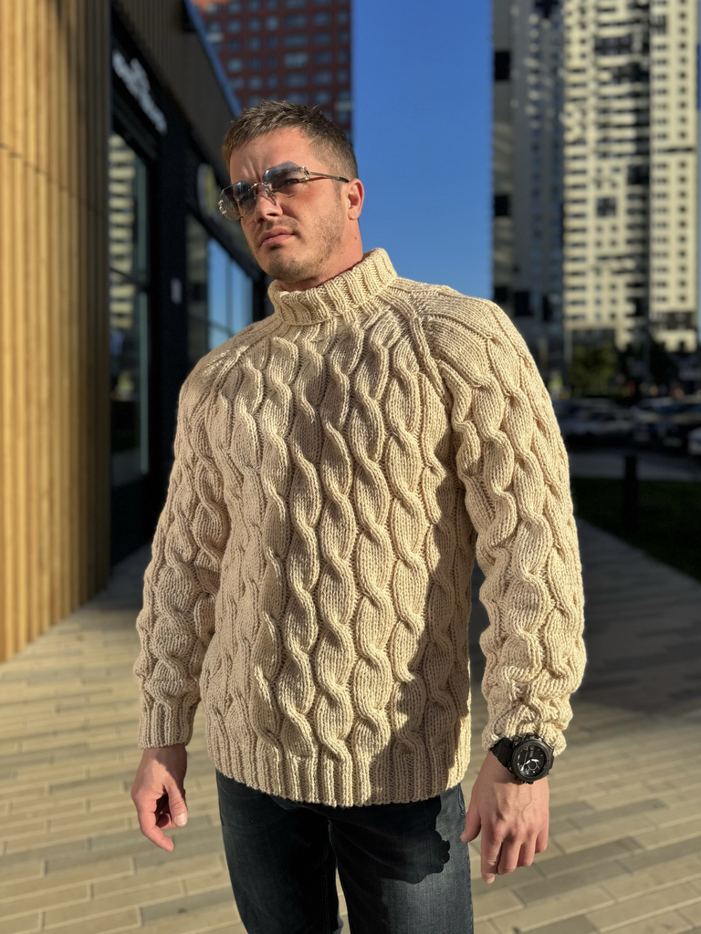 Объемная вязка с объемными косами делает образ брутальным, сильным и одновременно эстетичным. Бежевый цвет подчёркивает загар, выгодно смотрится с джинсами, брюками и верхней одеждой любой фактуры — от кожи до шерсти.