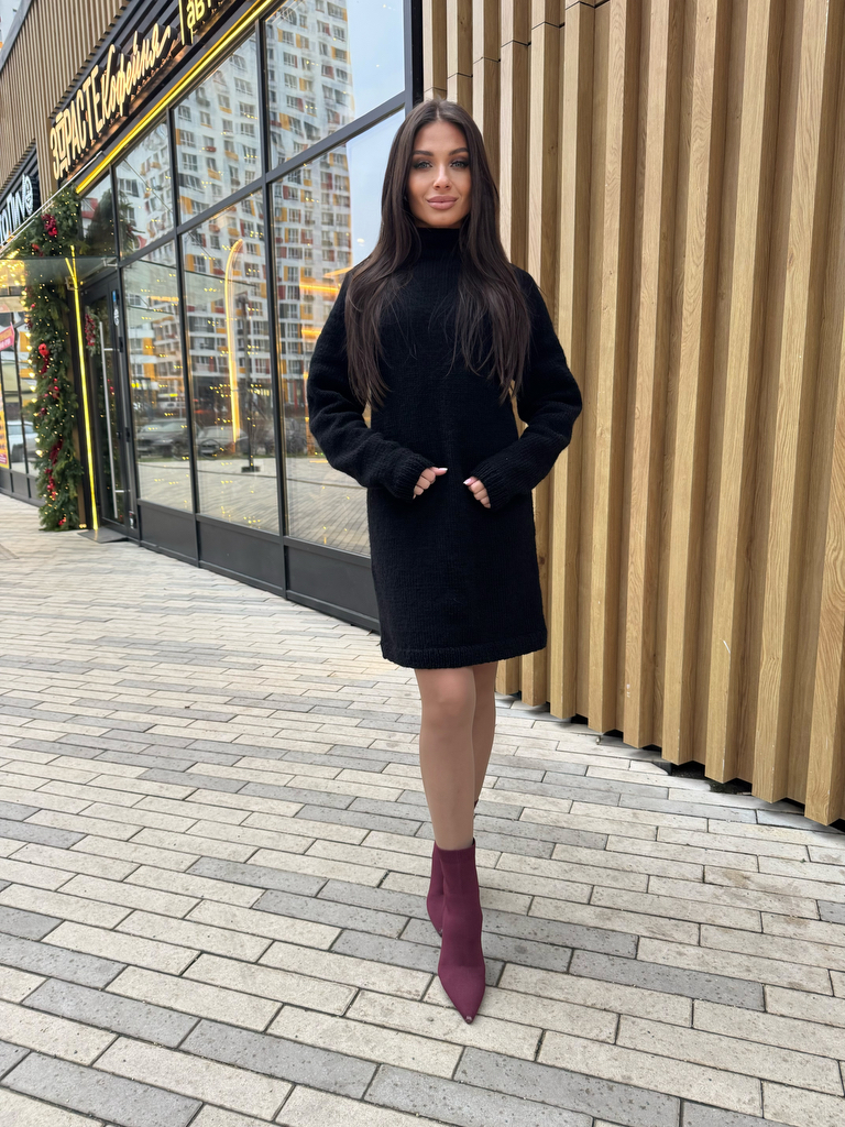 Этот черный свитер-платье — идеальная находка для девушки, которая ценит комфорт, стиль и минимализм с характером. Плотная ручная вязка создаёт аккуратный силуэт, подчёркивает фигуру и дарит ощущение уюта в любую погоду.