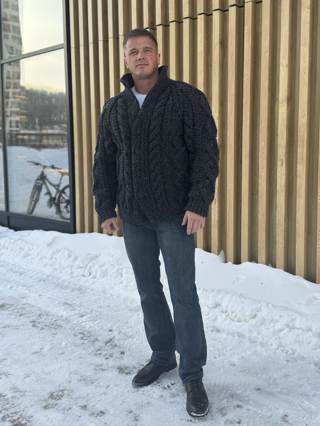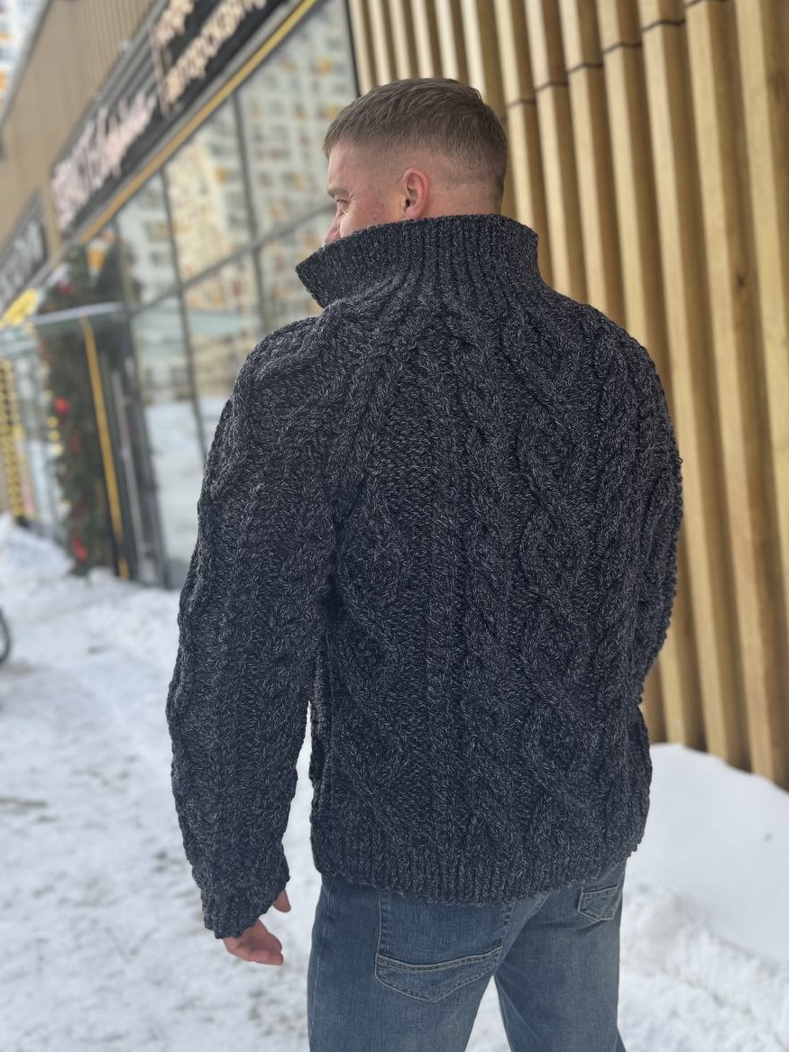 На фотографии теплый кардиган для мужчин от Shapar, бренда вязаной одежды ручной работы в интернет-магазине связанных спицами вещей.